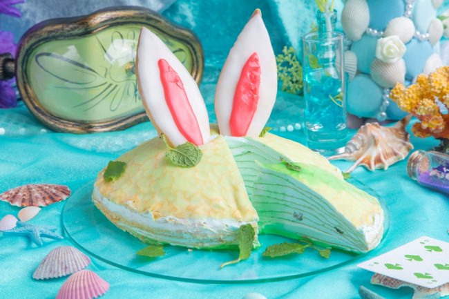 こちらも不思議の国のレギュラーメンバー・白うさぎの大きな耳が目を引くミルクレープのホールケーキ。何層にも重なる クレープ生地の間にはミントとチーズという意外な組み合わせのクリームが…意外だからこそ、この味に出会った時の驚きは倍増!この夏、ハマる人が続出してしまうかもしれません。