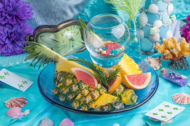 パイナップルやピンクグレープフルーツなど、フレッシュフルーツもご用意していますが、不思議な国の住人がいたずら心を発揮しちょっとしたサプライズが仕掛けられていることも。 よーく見てみてください…グラスの中に小さな小さないちごのお魚が!ビュッフェ台で見つけられた貴方は超ラッキーかも!?