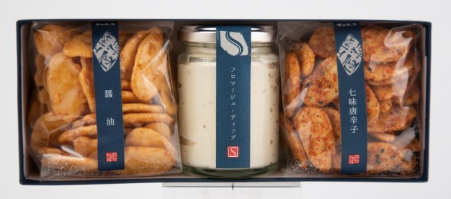 せんべい・あられ専門店「煎餅工房さがえ屋」の代表的な商品である「しみかりせん」とそれを引き立てるセゾンファクトリーの「フロマージュディップ」をセットにし、ファッション界で世界をリードする「佐藤繊維」の佐藤正樹氏が監修した美しいパッケージに詰合せました。山形県が誇るものづくり企業3社による“素材にこだわった山形のプレミアムギフト”です。