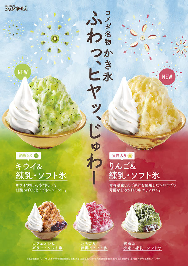 コメダの夏がやってきました!「ふわっ、ヒヤッ、じゅわー」が合言葉のコメダ名物のかき氷。今年も新フレーバーを加えて登場です。この合言葉は、ふわっとしたかき氷を一口食べれば、ヒヤッとした氷の食感、その後みずみずしいシロップが口の中でじゅわーと広がる様を表現。お店で手入れされた鋭い大きな刃で氷を削り、家庭では再現できない氷に仕上げています。また、毎年大好評の選べるトッピングを組み合わせて、かき氷を自分好みの「デザート氷」にカスタマイズできるのもコメダ流。食べ応えたっぷりのサイズでお楽しみください。
