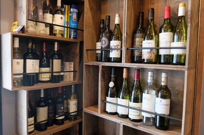 ワイン箱を使って作られた棚。実はトイレの扉となっております。