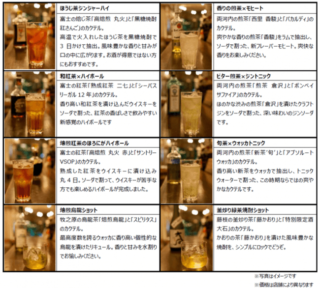 茶を酒に漬け、抽出するシンプルな工程ながら、香り、味ともに多彩に変化していく様はまさに「茶×酒の出会い」。個性的な静岡の茶葉を選抜し、相性の良いリキュールとの組み合わせを研究。現在8種類のメニューが完成しています。展開メニューは今後も増えていく予定です。
