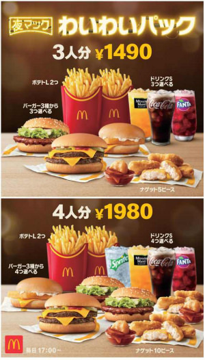 日本マクドナルド株式会社(本社:東京都新宿区、代表取締役社長兼CEO:日色 保)は、マクドナルドのディナー時間帯をさらにお得にお楽しみいただけるよう、ファミリーのお客様も大満足の3~4人分の特別なパック「わいわいパック」を、夜マック限定で8月7日(水)17時00分より全国のマクドナルド店舗にて期間限定で販売いたします。
