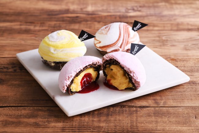シュークリームとマシュマロを掛け合わせた新食感スイーツ。ココアの風味を生かしたシュー生地から、たっぷりの濃厚なカスタードクリームと、酸味を効かせたフルーツジャムが溢れ出します。