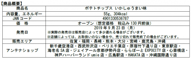 カルビー株式会社(本社:東京都千代田区、代表取締役社長兼CEO:伊藤 秀二)は、佐賀県のお土産の定番の味わいを再現した『ポテトチップス いかしゅうまい味』を数量限定・期間限定で2019年9月23日(月)から、佐賀・福岡・長崎・熊本・大分・宮崎・鹿児島・沖縄(8県)で発売します。また、カルビーアンテナショップでも随時、販売予定です。商品は無くなり次第終了となります(11月上旬終売予定)。