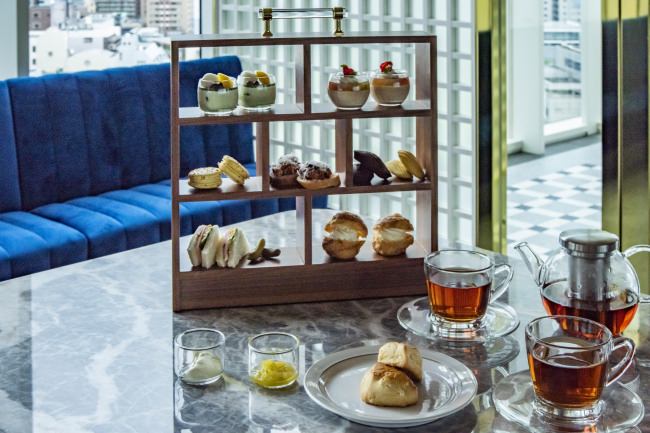 3階ホテルフロントに併設するカフェラウンジ。九州の食材を使用したパスタやキッシュ、サンドウィッチなどの軽食をご提供する他、八女茶を使用したベリーヌやカリカリの生地と濃厚なカスタードのシュークリームなど、約10品の自家製スイーツやセイボリーが楽しめるアフタヌーンティーもご用意。
