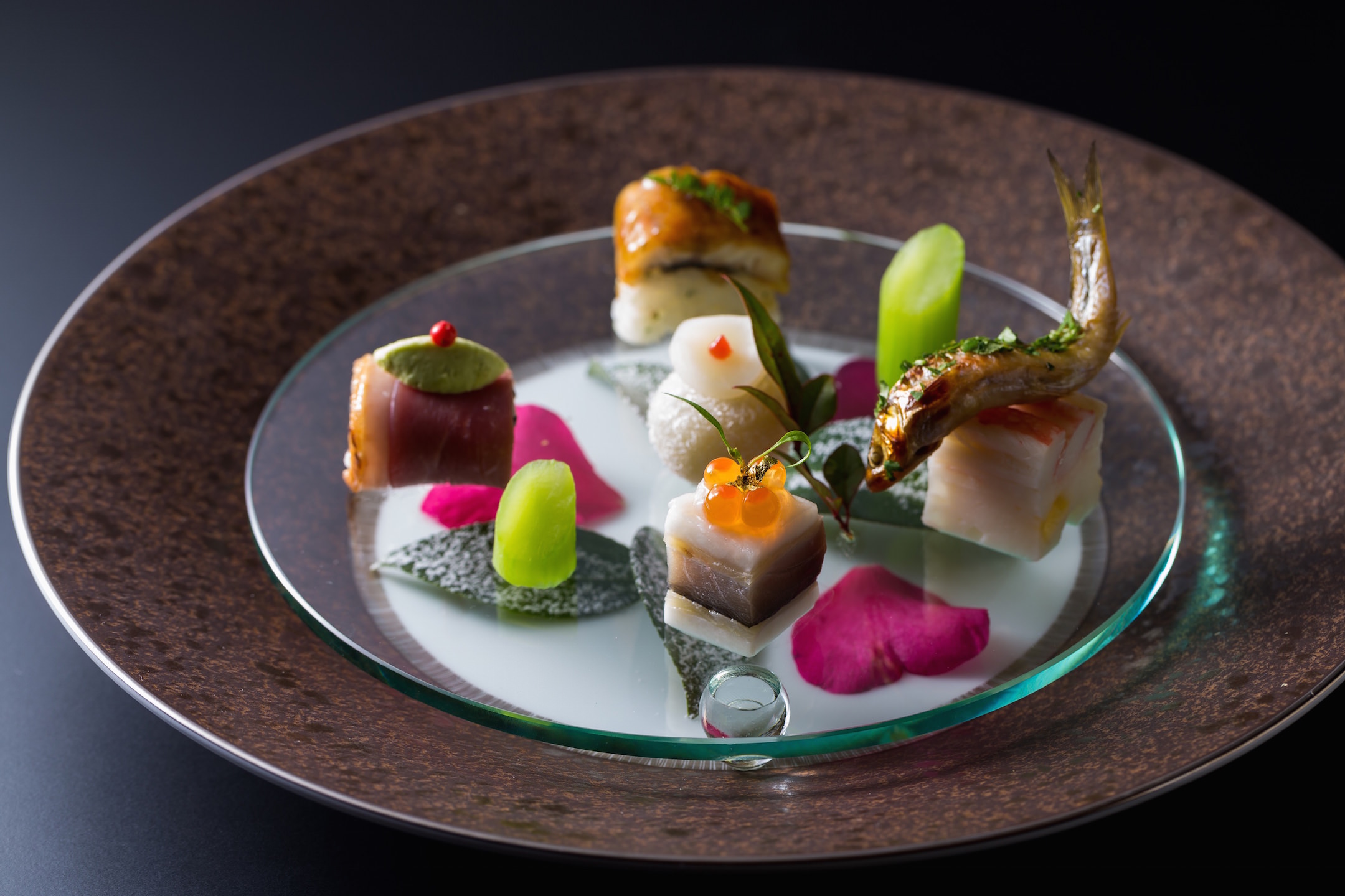 星のや京都が位置する奥嵐山は、山と川に囲まれ、京都の中でも豊かな自然が残る場所です。星のや京都のダイニングでは、「五味自在」をコンセプトに、四季折々の嵐山の情景を映した会席料理を提供しています。