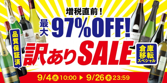 増税直前!9/4(水)10時より、史上最大級の訳ありSALEが開催!シャンパンも高級ボルドーも食品も、中身には全く問題ないワインが最大97%OFFの訳アリ特別価格で大量販売!