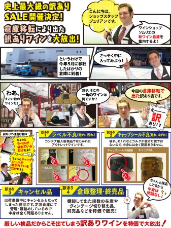 輸入時などに行われる検品作業にて見つかった、ラベル・キャップシール不良のもの、倉庫整理品、終売品など、中身には問題のないが、通常販売できないワインを訳あり品として、特別価格にて一斉販売致します。