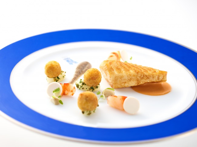 フランスでもよく使われる的鯛を香ばしくムニエルにし、甲殻類のエッセンスを加えたクリーミーなソースで召し上がっていただきます。ムール貝のクロメスキを添えて。