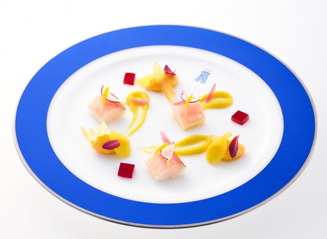 秋から冬にかけて旬を迎えるヤガラをショーフロワ仕立て(加熱したものを冷やして供する伝統料理)にし、キャロットの甘味が楽しめるバヴァロアと黄キャロットのムースを添えて。