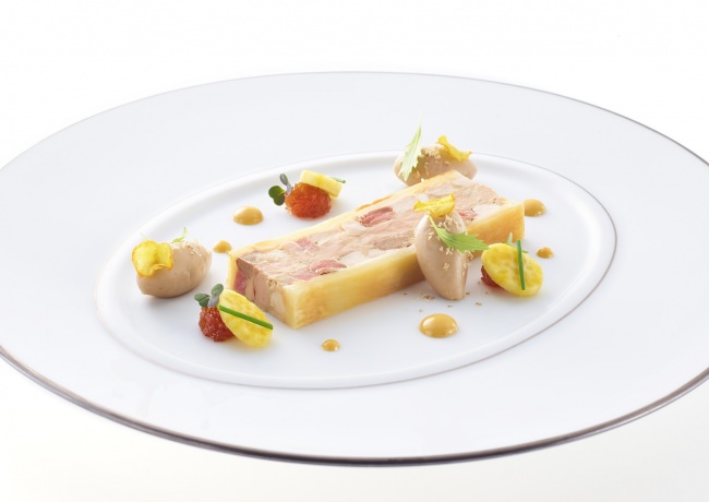 フォアグラとピジョンとをパイ包み焼にした冷前菜。洋梨をヴァンジョーヌ(フランスのジュラ地方独特の黄色みの強いワイン)の香りを付けたチャツネと、クリーミーなマロンのムースを添えて。