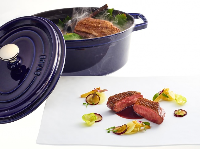幼鴨をローストし、葡萄の枝で燻煙仕立てにしました。大地の香りを連想させる西洋ゴボウのブレゼ(蒸し煮)とほのかな酸味が楽しめる葡萄のソースで召し上がっていただきます。