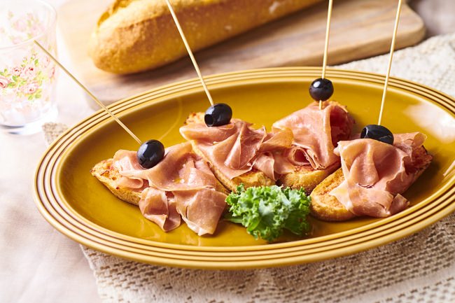 生ハムをカルターニャ地方の郷土料理パン・コン・トマテにのせてご提供致します。生ハムの旨味とトマトの酸味のコンビネーションをお楽しみ下さい。