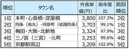 外食単価の高いタウンは、前年から1位と2位が入れ替わった。2位の「四条(烏丸)・河原町(祇園四条)」は調査開始以来、外食単価が1位であったが、本年度は単価が前年比マイナスとなり2位に後退。替わって、5年連続単価2位の「本町・心斎橋・淀屋橋」が関西圏では初めて単価が3,800円を記録したタウンとなり、1位を奪取。同タウンは飲酒を伴う外食のシェアが1位で、“酒の力”が単価アップに寄与していそうだ。