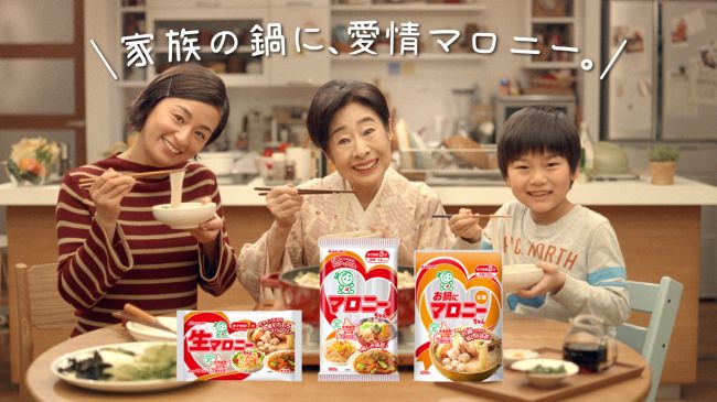 マロニーは、お馴染み中村玉緒さんと、新しくブランドキャラクターに尾野真千子さんを起用し、新キャッチコピーを「家族の鍋に、愛情マロニー」とし、お子さんが喜ぶ食材『マロニーちゃん』を情緒訴求する新CM「玉緒さんと真千子さん」篇を、10月1日から全国でオンエアいたします。