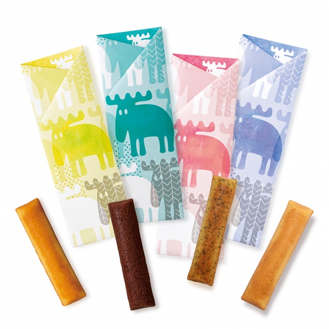 「エルク」がプリントされたフィナンシェ1本入りの包装紙は、開くとお皿とカトラリーが描かれたペーパーナプキンに変身!ボトルタイプの2個入りは、食べ終えた後にドリンクボトルとしても使え楽しさとエコをプラス。お友達のプチギフトにもぴったりです。