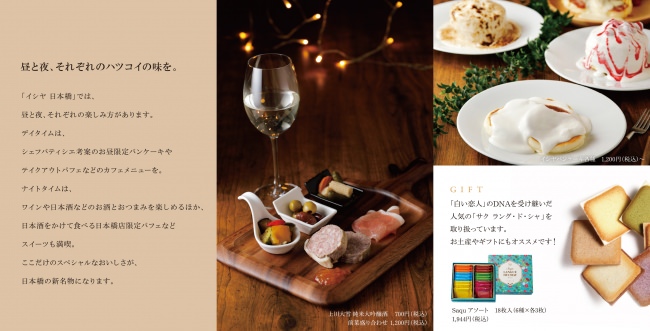 イブニング&ナイトタイムは、ワインや日本酒などのお酒とおつまみを楽しめるほか、日本酒をかけて食べる日本橋店限定のパフェなど、スイーツも満喫できます。