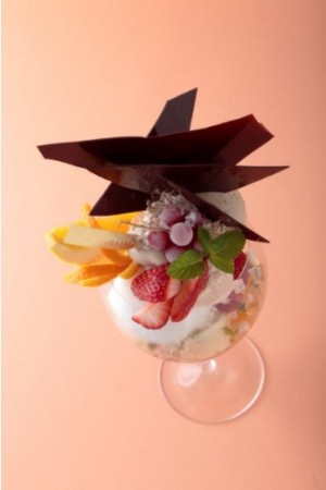 「メランジュフリュイ ロイヤルフルーティー」は、ロイヤルミルクティーとフルーツの酸味、ショコラの風味が絡み合う絶妙な組み合わせのパフェです。