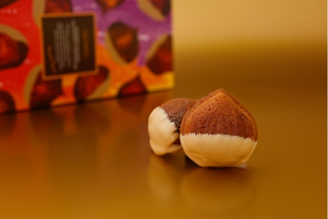 栗のペーストを使ったしっとり生地で、栗を丸ごと1粒包み、キャラメル風味のブロンドチョコレートをディップした焼き菓子です。