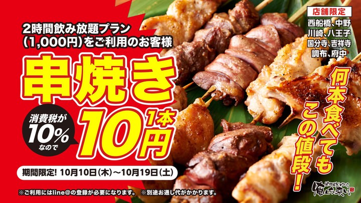 都内を中心に食べ放題×元気系居酒屋を展開している『居酒屋いくなら俺んち来い。』西船橋店/中野店/川崎店/八王子店/国分寺店/吉祥寺店/調布店/府中店では、2019年10月10日(木) 〜 2019年10月19日(土)までの10日間、串焼き7種類(※ もも、ぼんじり、つくね、はらみ、とんとろ、バラ、タン)をすべて10円(税別)で提供いたします。