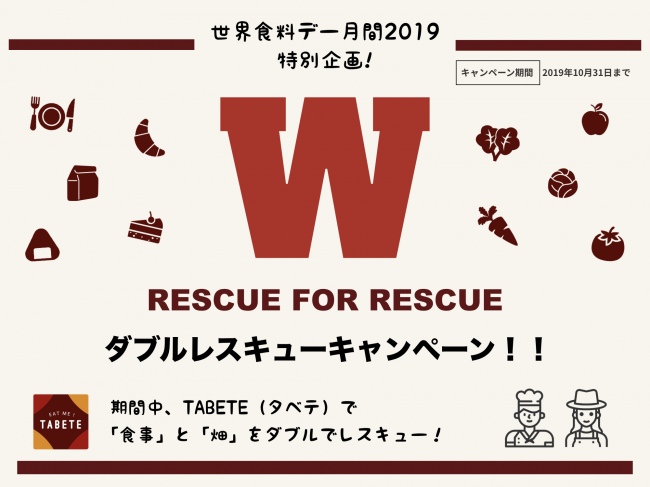 フードロスの削減を目指すフードシェアリングサービス「TABETE(タベテ)」を運営する株式会社コークッキング(本社:東京都港区、代表取締役社長:川越一磨)は、国連が定めた10月16日の世界食料デーに合わせて、「食事」と「畑」をWでレスキューする「Wレスキュー(ダブルレスキュー)」キャンペーンをスタートしました。