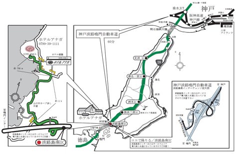 <お車で>名神・中国・山陽・阪神高速・第2神明・各高速道路から垂水JCTへ。神戸淡路鳴門自動車道に入り明石海峡大橋経由、淡路島南ICでお降り下さい。※垂水JCTからホテルまで約1時間。インターチェンジより約7分。