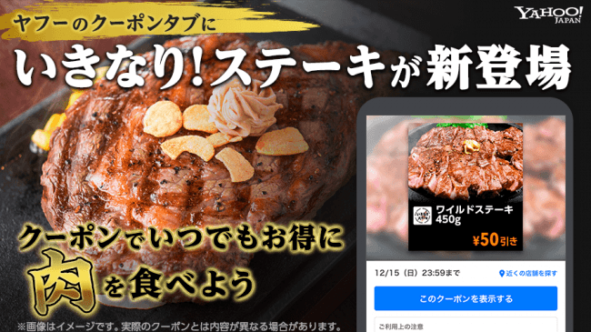 株式会社ペッパーフードサービス(本社/東京都墨田区・代表取締役社長CEO/一瀬邦夫)は、ヤフー株式会社(以下、Yahoo! JAPAN)が提供する「Yahoo! JAPAN」アプリ(iOS版、Android版)および、スマートフォンブラウザー版「Yahoo! JAPAN」のクーポンタブにて、「いきなり!ステーキ」のクーポン配信を11月1日(金)より開始します。