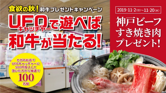 株式会社セガ エンタテインメント(本社:東京都大田区 代表取締役社長:上野 聖)は、2019年11月2日(水)より全国190店舗で、UFOキャッチャーに500円を投入すると1万円分の高級すき焼き肉が抽選で100名様に当たるプレゼントキャンペーンを実施いたします