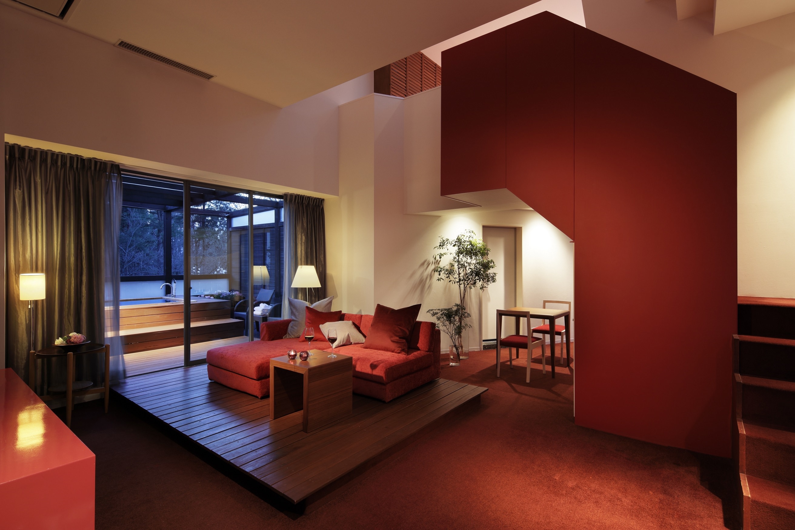 当ホテルは、日本有数のワインの産地という立地を活かし「ワインリゾート」をコンセプトとしています。全ての客室にワイングラスを備え、客室でもワインを存分に楽しむことができます。全20タイプの客室は、八ヶ岳を描いたボルドーカラーのインテリアに、リビングと寝室が分れたメゾネット、テラスで星を眺めながらバスタイムが楽しめるスイートルームなど、ひとりでも好みや滞在のスタイルに合わせて選べます。