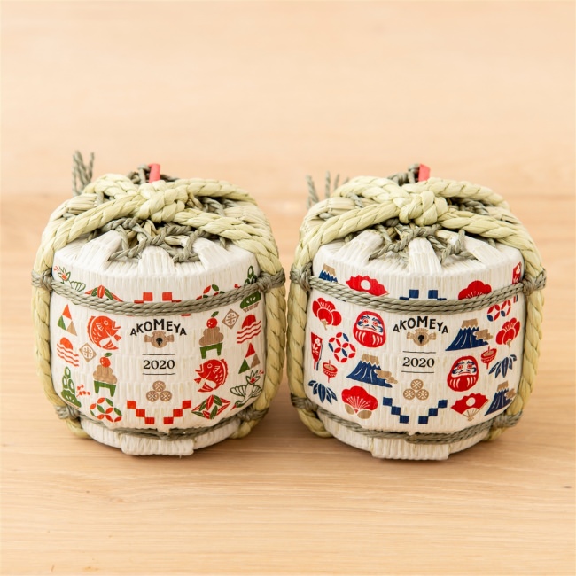 AKOMEYA TOKYOのオリジナルの吉祥文様をあしらった、古来の伝統的日本文化を象徴する豆樽。どちらも福を呼ぶお正月にふさわしい絵柄。お酒は、芳醇なふくらみがあり、爽やかなキレのある味わいの「川鶴」でご用意。内容量300ml。