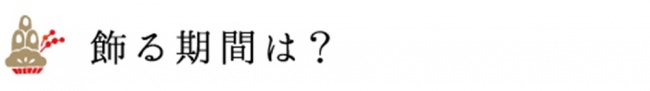 年末の大掃除が終わったら飾りますが、29日(苦松・苦餅)と31日(お葬式と同じ一夜飾りを指す)は避けましょう。飾りは松の内(7日)にしまいます。地域によっては小正月である15日まで飾ります。昔は12月13日から1月20日まで飾っていましたが、20日に家光公が亡くなったため避けるようになりました。