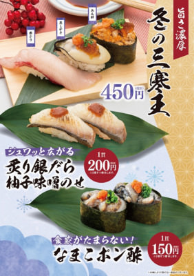 「冬の三寒王」は、冬に旬を迎える寒ぶり、蒸しがき、あん肝を3貫セットにして提供します。いずれも冬を楽しんでいただけるネタで、旬の味を少しずつ味わいたい方にもお薦めのメニューです。