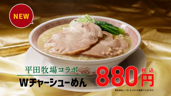 その平田牧場が丁寧に育てた、繊細な肉質と甘みが特徴の金華豚と三元豚のチャーシューを贅沢に使用したコラボレーション商品「平田牧場コラボ Wチャーシューめん」を11月21日(木)より発売いたします。スープはコクのある濃厚豚骨醤油。