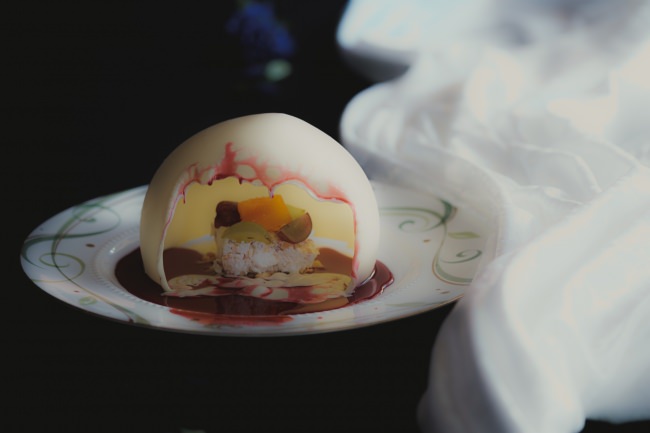 お食事の最後には、クリスマスツリーに飾られるオーナメントを模した、特別なデザートをご用意いたしました。雪山やかまくらを連想させる、好奇心をくすぐる演出に注目です。