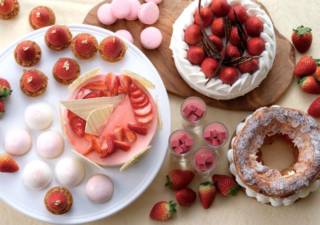 いちごのショートケーキ/いちごのタルト/いちごのムース/いちごとミルクのフレンチトースト/いちごとマシュマロのベイクドタルト/いちごアイスクリーム/いちごとマシュマロのベイクドタルト/いちごのスムージー/パリブレスト/モエ・エ・シャンドン シャーベット/ローストポーク ブーランジェ風/ほうれん草とベーコンのキッシュ/チーズパイ/ブリのグリル/じゃがいものギャレット/チーズの盛り合わせ/ベジタブルカレー/フライドポテト エスニック風/チキンと香草のトマト煮込み/いちごのフルーツティー/コーヒー/紅茶 他
