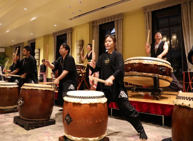 「太閤太鼓(たいこうだいこ)大阪城」は、“大阪城至近だからこそできるおもてなしがしたい”というTLOメンバーの発意から、伝統芸能の素晴らしさを広めている大藏基誠(能楽師狂言方)氏監修のもと、大阪らしい伝統芸能をモダンにアレンジして従業員自ら演じる“おもてなし演目”として誕生しました。普段はTLOでシェフやウェディングプランナーとして従事する“芸事未経験者たち”が衣装を纏い1日に複数回に渡り、おもてなしの時間を演じています。演目内容は、「凛とした音色が響き渡る琴」「力強く大迫力の和太鼓」「昇り龍を表した龍踊り」で観客を魅了し、最後の「オリジナル歌詞を書き下ろした河内音頭」では会場一体となりお楽しみ頂けます。