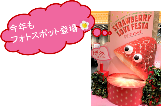 九州最大級のおみやげ処 「マイング」では、今年度で4回目となる「ストロベリースイーツフェスタ2020」を開催します。マイングでは今の時期、博多あまおうをはじめ美味しいいちごスイーツなどがいっぱい。そんなマイングで、各店舗選りすぐりの「いちご」を使った商品の中から、お客様投票でいちごスイーツ人気No.1を決めるコンテストを行います。春の訪れをいち早く告げる“いちごスイーツ処・マイング”へぜひ、お越しください!