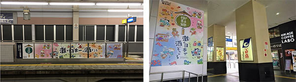 具体的には、灘五郷の最寄り駅である阪神電車の10駅を対象に、駅の各所に「灘五郷」が育んできた日本酒文化をほっこり和風テイストで表現したイラストの装飾を施しています。