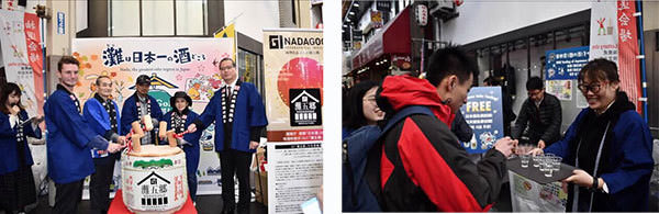 更に、近年、日本酒に興味を持つインバウンドのお客さまが増加しており、灘五郷を訪れる外国人の方も増加傾向にあることから、外国人の方々へのPR活動を定期的に開催しており、今年度は、2019年12月13日に外国人観光客で賑わう黒門市場で開催しました。