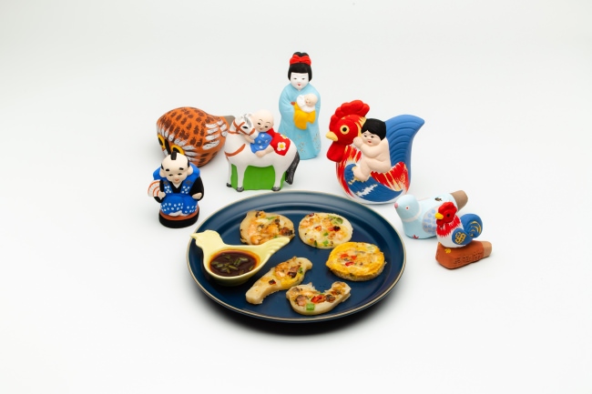 伝統工芸「弓野人形」をモチーフにした「カラフルなチヂミ」。弓野人形の特徴であるカラフルな色味を赤パプリカや青唐辛子で表現。また、弓野人形のモチーフとしても使われる鳥型のチヂミをつくって提供。弓野人形の色鮮やかで丸みをおびた雰囲気を表現しています。