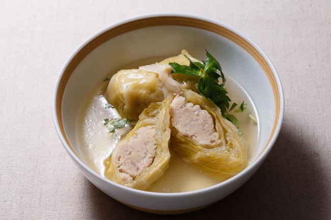 かつお節だしであっさりと食べやすい味に仕立てたジューシーなロールキャベツです。