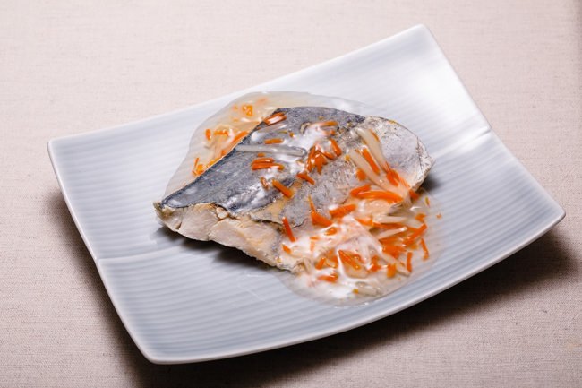 ふっくら焚きあげた鰆に、かつお節だしで仕上げた甘酢あんをかけました。