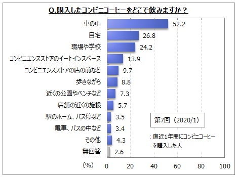 コンビニコーヒーの飲用場所は(複数回答)、「車の中」が直近1年間購入者の52.2%、「自宅」「職場や学校」が各20%台です。「自宅」「職場や学校」は、若年層で比率が高くなっています。