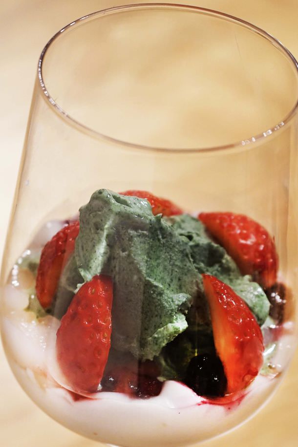 生スピルリナのタベルモアイスを使い、スパークリンクワインを注いで楽しめる大人のパルフェ。