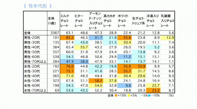性年代によっても違いがあるようです。男女ともに、年代が低いほうが高いのが「ミルクチョコレート」と「ホワイトチョコレート」。「アーモンド・ナッツ入りチョコレート」は50代以上に人気です。「洋酒入りチョコレート」は60代以上で好まれ、特に女性では2割を超えています。男女差の大きい「生チョコ・トリュフ系」は、女性の特に若年層で高くなっていました。