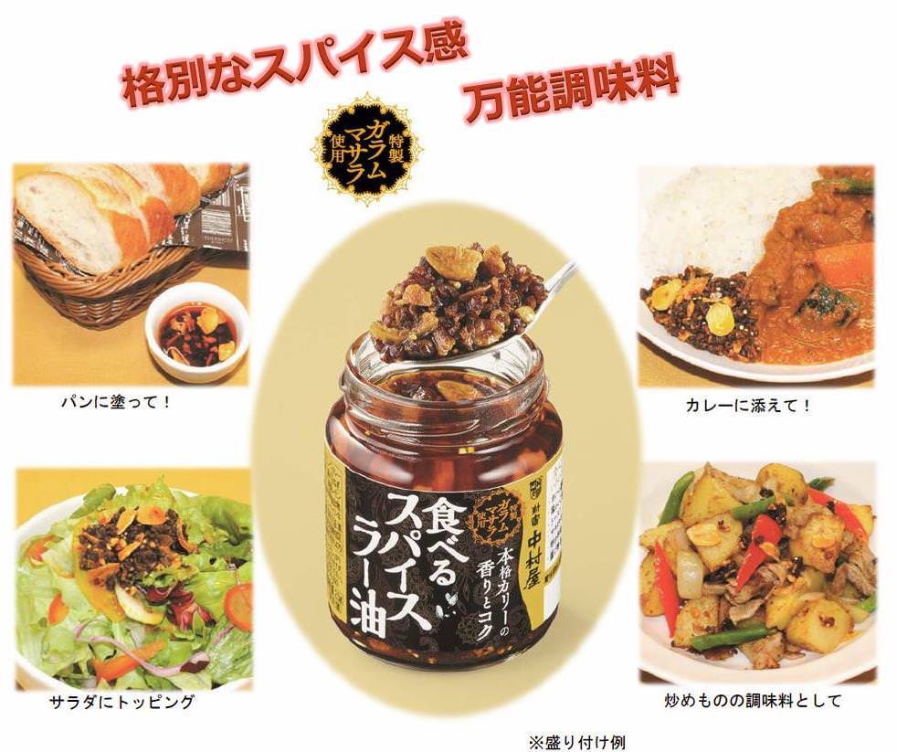 そのような中、昭和初期からレストランでインドカリーや中国料理を提供してきた中村屋が、長年培われたスパイスの調合技術を活かし、これまでの中華系の具入りラー油とは一線を画す、新しい「スパイスタイプ」の具入りラー油「本格カリーの香りとコク 食べるスパイスラー油」を開発しました。手軽に使える万能調味料で、特製ガラムマサラ、ナッツやガーリック、ホールスパイスなどを使用し、スパイスの豊かな香りと弾ける食感をお楽しみいただけます。