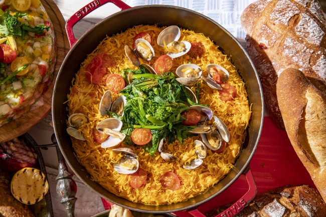 細パスタを使ったパエリア。サフランのエスニックな香りと、あさりのうま味がパスタにギュッと染み込んだ料理です。カリッとおこげになった麺もお忘れなく。