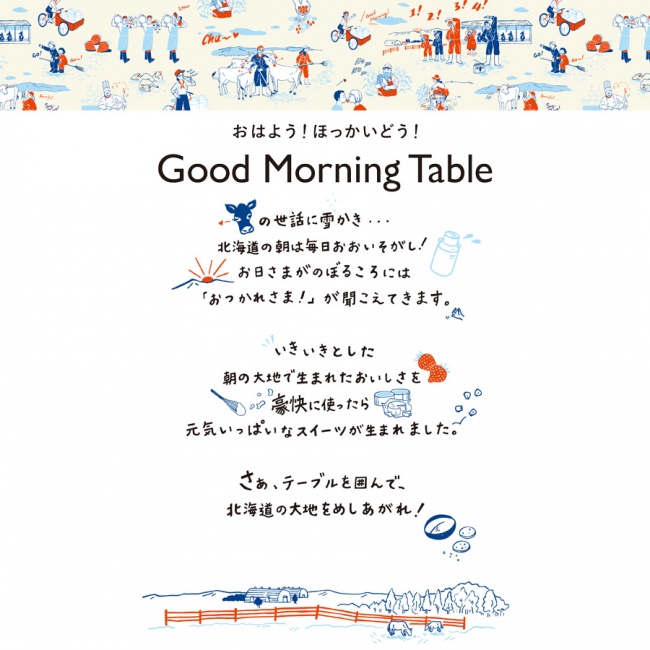 “北海道の美味しい!”をお届けするスイーツブランド『Good Morning Table(グッドモーニングテーブル)』は、北海道ならではの素材の良さを最大限に活かすべく、できる限りシンプルな素材を豪快に使用した、元気いっぱいのスイーツを発信するブランドです。
