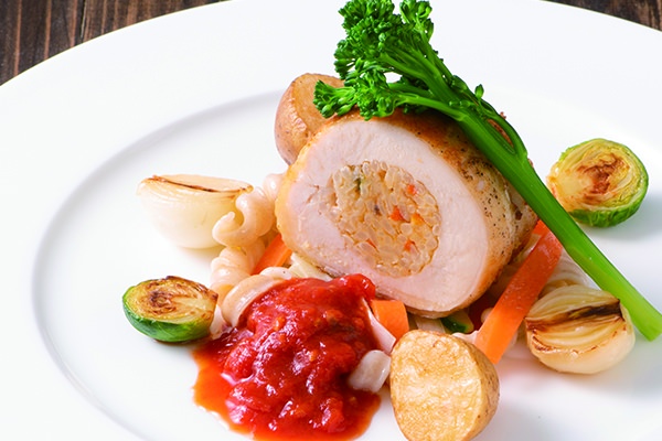 インボルティーニとはイタリア語で包む・巻くという意味を持ちます。今回はカタリーナがふるまう鶏の詰め物をイメージして松の実とお米を詰め、イタリア産トマトソースをかけてご提供いたします。しっとりと柔らかい鶏肉は旨味を閉じ込め仕上げました。